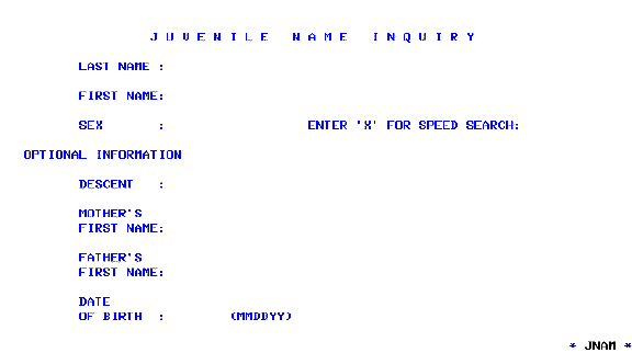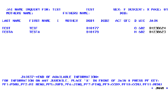 For information on a selected juvenile, place an `X' in front of the JAIN and press the appropriate PF or F key to request a transaction available from the message at the bottom of the screen.