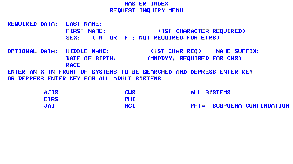 JAI users may use the PF2 or F2 key to navigate to Master Index. Through Master Index, Probation users may obtain the LASD Booking System as well as the Adult Court system, TCIS. To navigate from one system to another, use the PA2 key. To navigate within a system, following the instructions at the bottom of each screen.