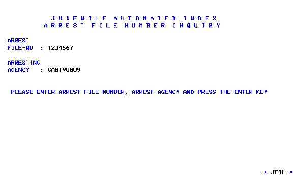FUNCTION: This transaction retrieves and displays name, arrest date and JAIN of all juveniles arrested and reported by the same agency and arrest file number. JFIL can be used to find companions on an arrest when the file number is entered in a consistent format by the arresting agency.