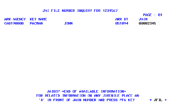 If the file number is found, the response will be an intermediate screen, entitled JAI NUMBER INQUIRY FOR 00000000000 (file #). One or more names will display.