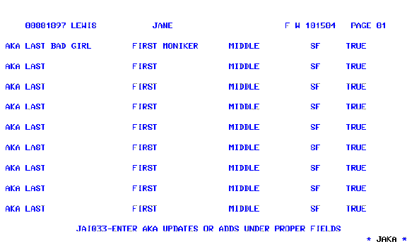 If more than one screen is needed to add AKA names, press the ENTER key to obtain a blank JAKA screen upon successful completion of the first JAKA; or, paging (PA1 Key or Page Up Key) should be used to request the next screen.