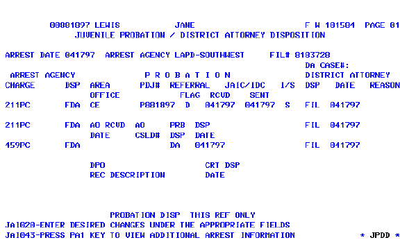 FUNCTION: This transaction is used by the Probation Department to add or update Probation disposition data for an arrest or District Attorney reject dispositions for each charge. Since 1994, JPDD displays District Attorney disposition information pixed from PIMS. This transaction displays additional charges filed by the District Attorney as well as the charges entered by the arresting agency.