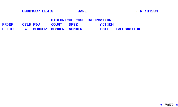 The response will be the PADD mask will the ability to add up to 13 lines of data. The first line contains the JAIN, name, sex, descent, and date of birth. User must verify that the JAIN and name are correct before adding historical information.