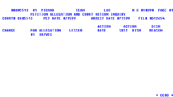 FUNCTION: This transaction is used to retrieve petition allegation and court action information related to arrest charges on a specific Juvenile Court Petition. It displays the relationship between initial charges and subsequent action. The format is similar to CC02, however, it can be used only for inquiries.