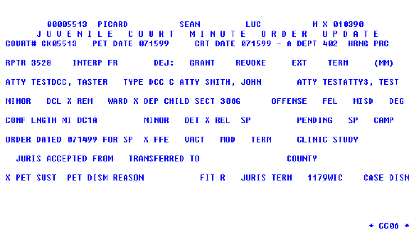 Any information previously entered through the "CASE DISM" indicator will be displayed. Changes may be made by keying new data directly under the existing information. New entries may be made under previously blank fields. Existing optional information may be deleted by keying a minus (-) under the first position of a field. Note: The result of adding or updating must meet the same editing requirements as adding a new minute order with CC05.