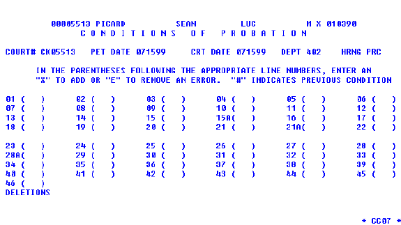 To update existing conditions, mark the PROB indicator on CC06 or request CC07 from the County Clerk Menu. The response will be page 1 of CC07 with previously marked conditions indicated by a pound sign (#). The operator may enter additional conditions using an "X" or may remove errors by keying "E" over an existing "#". Press the ENTER key.