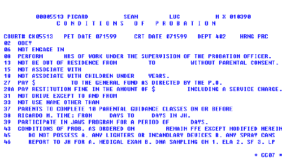 The response will be the first page of CC07. Numbers 1 through 39 match the numbers on the Conditions of Probation Minute Order. Number 97 is used for comments. Numbers 40 through 47 are not used at this time.