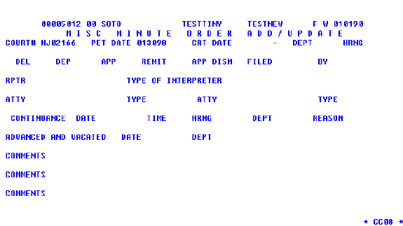 Optional fields may be deleted by keying a minus sign (-) directly under the first position displayed. Existing data may be changed by keying the new information directly below it. A miscellaneous minute order may be deleted by keying the word DELETE under the Court Date.