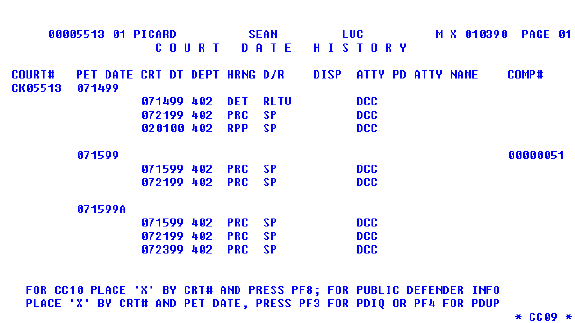 CC09 provides access to CC10, the Register of Action Inquiry, through the use of the PF8 key (PFK8 is PF Key #8, or PF8). The operator keys an "X" in front of the desired court#, on any page of CC09, and presses PF8. The Register of Action Inquiry for that court# will be displayed.
