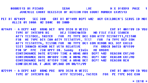 The response will be a printout of the entire Register of Action for the JAIN and Court # selected. When completed, CCMU will be displayed.