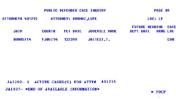 The response will be a print out of all the active cases currently assigned to the attorney. When completed, PDMU will be displayed with a message.